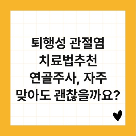 퇴행성 관절염은 많은 분들이 겪는 고통스러운 질환입니다. 이로 인해 일상생활이 불편해지는 경우가 많죠. 치료법 중 하나로 연골주사가 주목받고 있는데요, 과연 자주 맞아도 괜찮을까요? 오늘은 퇴행성 관절염 치료법으로 추천되는 연골주사에 대해 깊이 알아보고, 그 효과와 안전성에 대해 논의해 보겠습니다. 이 글을 통해 여러분의 궁금증을 해소하고, 더 나은 선택을 하실 수 있도록 돕겠습니다.